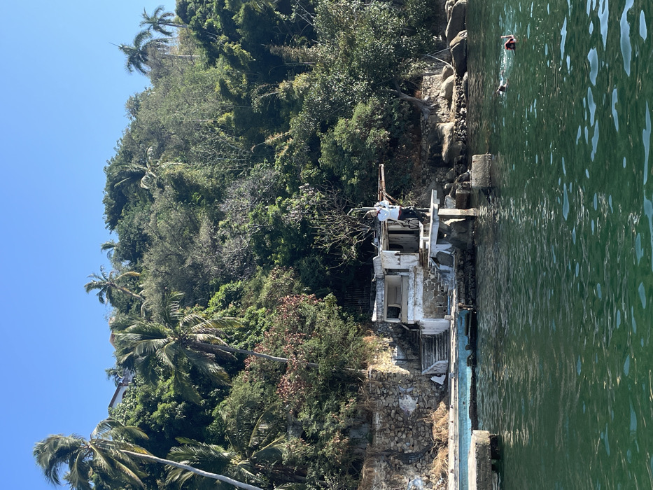 Lush green foliage covers a hillside beside the ocean. A dilapidated white structure, possibly a building or part of a boat, sits on the edge of the water, appearing to be in ruins. Concrete steps lead into the water, which has a rippling surface. Two figures are swimming in the water, visible in the upper right corner of the image. Palm trees dot the landscape, and a clear blue sky is visible above.