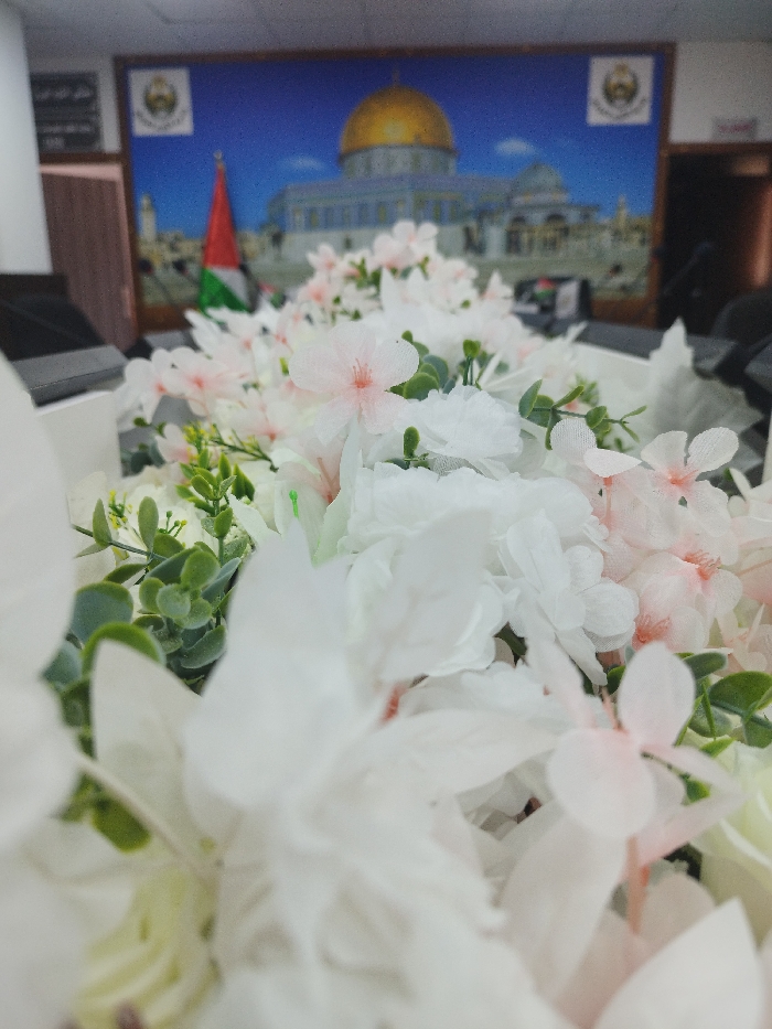 The image depicts an indoor setting, likely a formal meeting or office space, located in the city of Al-Kum, Palestinian Territory. The immediate foreground is dominated by a dense, artificial floral arrangement primarily composed of white and light pink blossoms interspersed with green foliage. This arrangement is positioned centrally on what appears to be a long conference table. In the blurred background, a large wall-mounted image or mural displays a detailed depiction of the Dome of the Rock with its golden dome and surrounding Jerusalem cityscape. To the left within this mural, a Palestinian flag is prominently visible. Flanking the mural on the wall are two blurred circular emblems, consistent with official Palestinian Authority seals. Portions of dark chairs and table surfaces are discernible beyond the floral arrangement, indicating a structured interior environment. No individuals are visible in the frame.