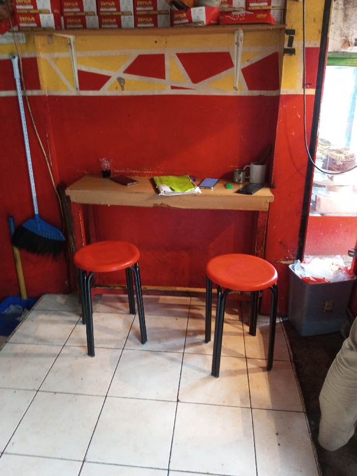 The image displays an interior scene in Ambakirano, Madagascar, featuring red walls with a horizontal yellow stripe and an irregular red and yellow geometric pattern above. A high wooden shelf is mounted on the wall, holding multiple rectangular boxes, predominantly red and white, labeled "DEPIUM". Below this, a narrow wooden counter is positioned against the red wall. On the counter, from left to right, are a clear plastic cup containing a dark liquid, a red smartphone, a crumpled green item resting on papers, a blue/purple smartphone, a small green globular object, a black smartphone, a white ceramic mug, and a bundle of dark sticks. Two red-topped stools with black metal legs are situated in front of the counter on a light-colored tiled floor with visible grout. To the far left, a blue and black broom with a white handle leans against the wall, alongside a yellow stick and a blue dustpan. The far right of the frame reveals a partial view of an opening, possibly a doorway or window, and a grey plastic bin with a white plastic bag liner. A person's lower leg, clad in light-colored trousers, is partially visible on the far right edge of the frame.