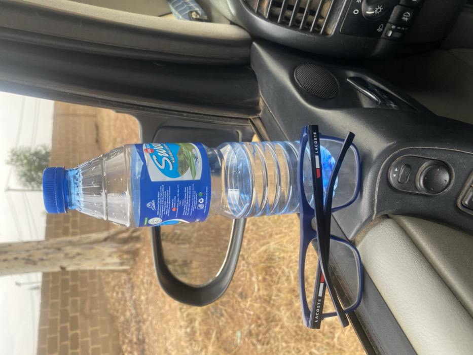 The image displays a half-full plastic bottle of Swan Natural Spring Water with a blue cap and label, alongside a pair of blue-framed Lacoste eyeglasses. Both items are positioned on the interior door panel of a vehicle, adjacent to the window. The water bottle's label identifies its origin and manufacturer: "PRODUCT OF SWAN NATURAL SPRING WATER From the Assop Hills of Plateau State," manufactured by "UAC FOODS LIMITED, Plot 181, Dadin Kowa Ind. Estate, Jos, Plateau State, Nigeria." The eyeglasses bear "LACOSTE" branding on the temples. Through the vehicle's window, a dry, open outdoor environment is visible, characterized by yellowish-brown ground cover, a prominent light-colored tree trunk, a low brick wall, and utility lines against a light sky. No individuals are present.