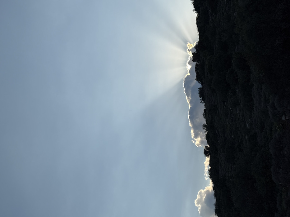 The image depicts a natural landscape within the Lachish Regional Council, Israel. The upper two-thirds of the frame features a clear, light blue sky. A band of cumuliform clouds stretches horizontally across the mid-ground. From behind a central cloud mass, obscured by dense cloud cover on the right side of the frame, distinct crepuscular rays fan upwards and outwards, illuminating the sky. The edges of the clouds are brightly outlined in white due to the backlighting. The lower third of the image comprises a dark, silhouetted hillside, heavily vegetated with dense scrub brush and scattered individual trees, all appearing as dark forms against the brighter sky. No individuals, animals, or man-made structures are visible. The scene is characterized by strong backlighting, indicative of either sunrise or sunset.