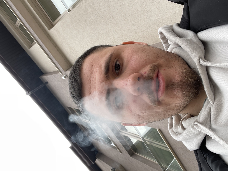 The scene is located in the city of Svilengrad, Bulgaria. An adult male is captured in a low-angle, close-up photograph. He has short dark hair, a mustache, and stubble, with visible acne scarring on his cheeks. The subject is wearing a light grey hooded sweatshirt beneath a black jacket. He is exhaling smoke from his mouth, which dissipates towards the upper left of the frame. The background consists of a multi-story building with light beige stucco or rendered walls, multiple dark-framed windows, and a dark brown gutter system running along the eaves. A white security camera or sensor is affixed to the building's facade. The sky above is overcast and white.
