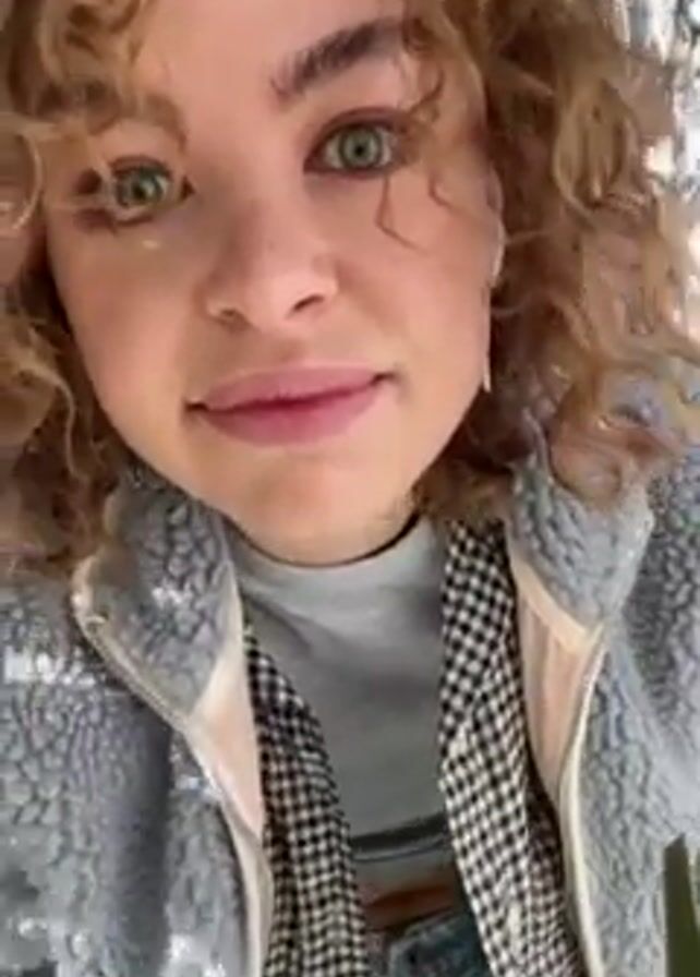 A woman with curly red hair stands outside in front of a white wall with long, thin branches hanging down. She wears a grey sherpa jacket over a grey t-shirt and a black and white flannel shirt, along with light blue jeans. She is wearing earrings and has what appears to be in-ear headphones. She pulls a roll of white material, possibly tape or string, from a stick propped against the wall. The environment is bright and sunny, with some green foliage visible on the left side of the frame.