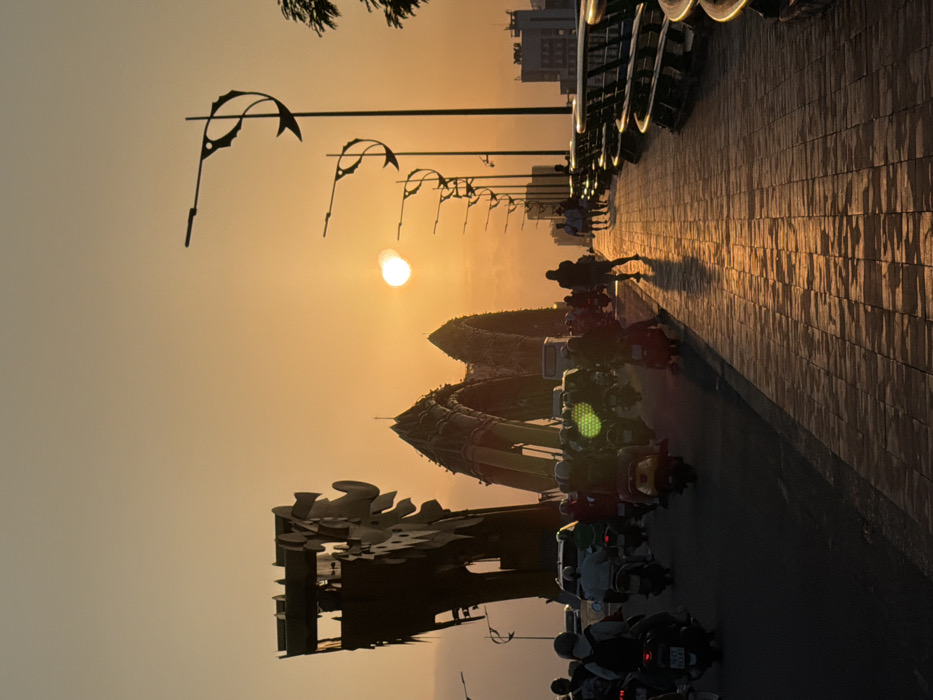 The image depicts the Dragon Bridge (Cầu Rồng) in Đà Nẵng, Vietnam, during either sunset or sunrise, characterized by a dominant orange-yellow sky. The prominent structure of the dragon's head is visible on the far left, connected to a section of the bridge's arched body. A multi-lane roadway on the bridge occupies the left side of the frame, densely trafficked with numerous motorcycles and scooters, mostly silhouetted figures wearing helmets, along with at least one light-colored automobile. On the right, a brick-ppaved pedestrian walkway extends into the background, bordered by a series of streetlights featuring decorative, fish-shaped finials. Several individuals are present on the walkway, appearing as silhouettes with elongated shadows cast towards the foreground; one person stands centrally in the mid-ground, while a group walks further away. Modern seating or railing structures line the right edge of the walkway. In the distant background on the right, faint silhouettes of urban buildings and some tree foliage are visible against the horizon.