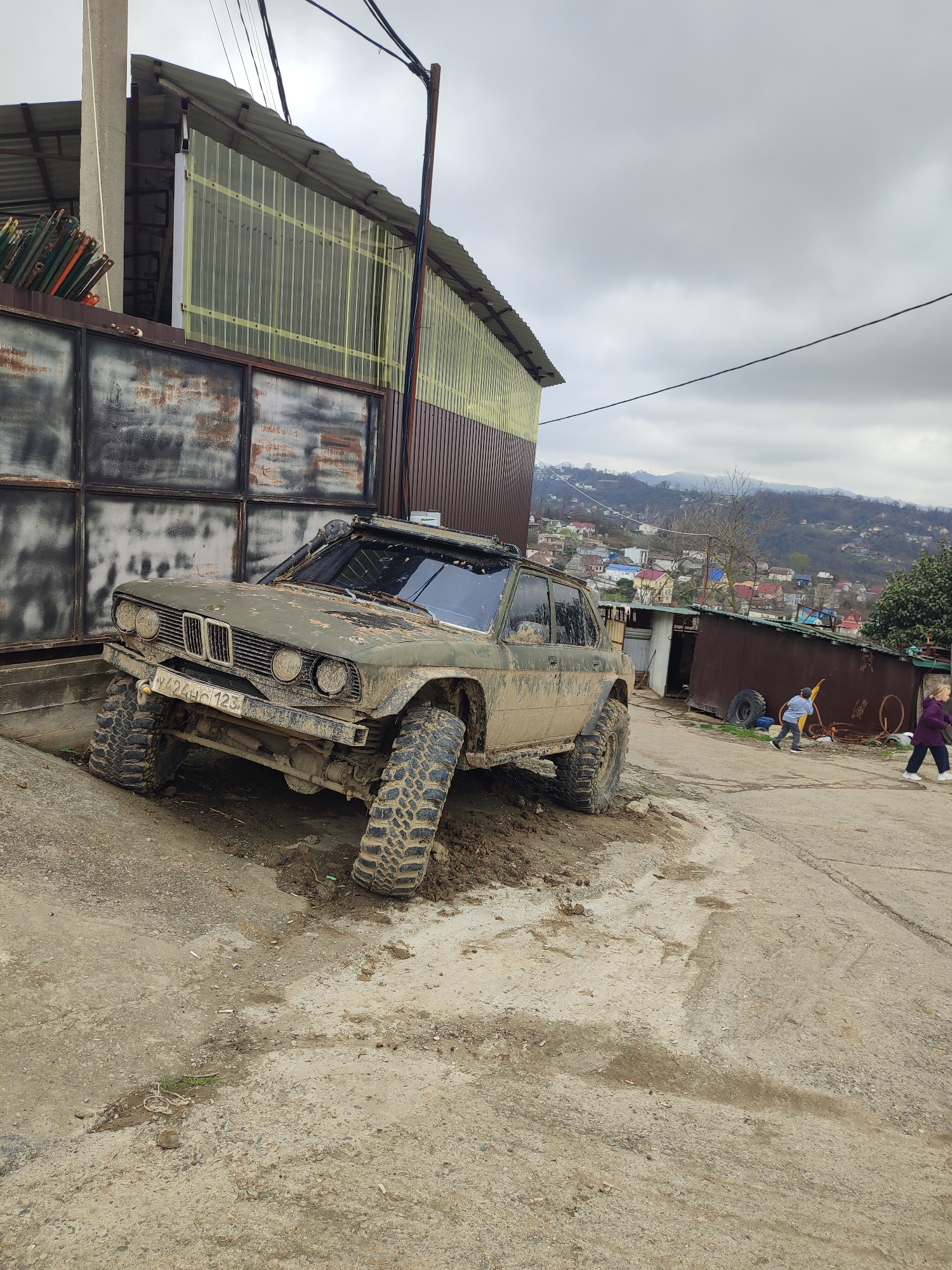 This image depicts a scene in the city of Bestuzhevskoye, Russia, under an overcast sky. The primary subject is a heavily mud-covered, olive-green custom off-road vehicle, appearing to be a modified sedan, possibly a BMW, with a Russian license plate "У24ЧЮ 123" on its front bumper. The vehicle is positioned on an incline, with its front left wheel significantly elevated and its front right wheel sunk into mud. It features large, aggressive off-road tires, a visible winch on the front bumper, a snorkel on the passenger side, and a roof rack. To the left of the vehicle, a tall concrete pole stands adjacent to a rusty metal gate or wall. Behind this, a structure with a corrugated metal roof and translucent yellowish corrugated plastic siding is visible, with stacked metal pipes to the far left. The ground in the foreground and around the vehicle is a mix of dirt and mud, showing tire tracks and small debris. To the right, a dirt road slopes gently downwards. Two individuals, appearing to be children, are present on this road. One child in a light blue shirt and dark pants is running rightward, holding a yellow object. Another child in a purple jacket and dark pants walks rightward. In the mid-ground, several corrugated metal structures, including what appears to be a shed or small building, are visible. An old tire and various discarded items are scattered near these structures. The background reveals a mountainous or hilly landscape dotted with numerous residential buildings under the grey sky. A utility wire stretches across the upper mid-ground.