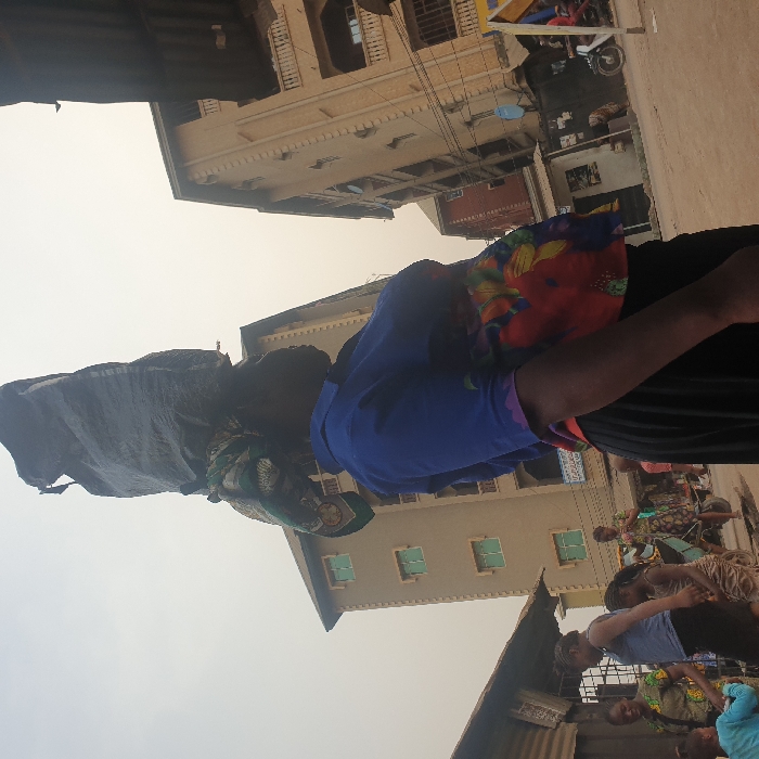 - "A woman carries a large bundle on her head, wrapped in dark fabric, wearing a patterned headscarf, a blue shirt, and dark pants" by FM-5FaYX2, licensed under CC BY 4.0