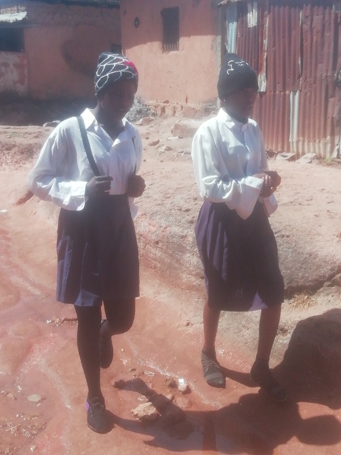 Two individuals, appearing female and young, are depicted outdoors in what appears to be an unpaved area of Jos, Nigeria