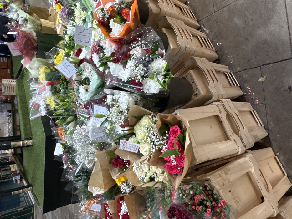 The image displays a bustling flower stall within Leeds Kirkgate Market, United Kingdom