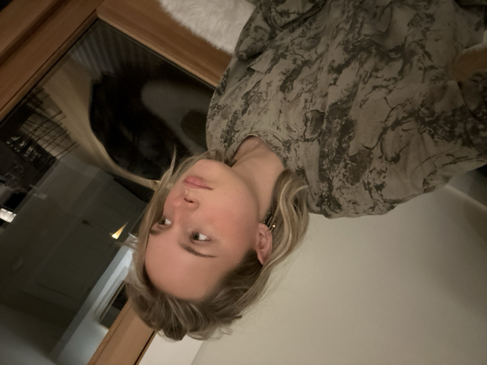 The image displays a young Caucasian female indoors in the city of Squamish, Canada. She has light blonde, shoulder-length hair, fair skin, and light-colored eyes, with a neutral expression as she gazes towards the right side of the frame. She wears a long-sleeved, crew-neck shirt with a mottled camouflage-like pattern in shades of grey and beige, along with several small earrings on her visible right ear and a delicate necklace. A fluffy white or off-white textured surface is partially visible in the lower-left foreground. To her right, a large window with a light-colored wooden frame reflects a dimly lit interior, revealing architectural elements such as a staircase with railings and an indistinct dark shape. The background features a plain, light-colored wall, and the scene is illuminated by soft, ambient artificial light.