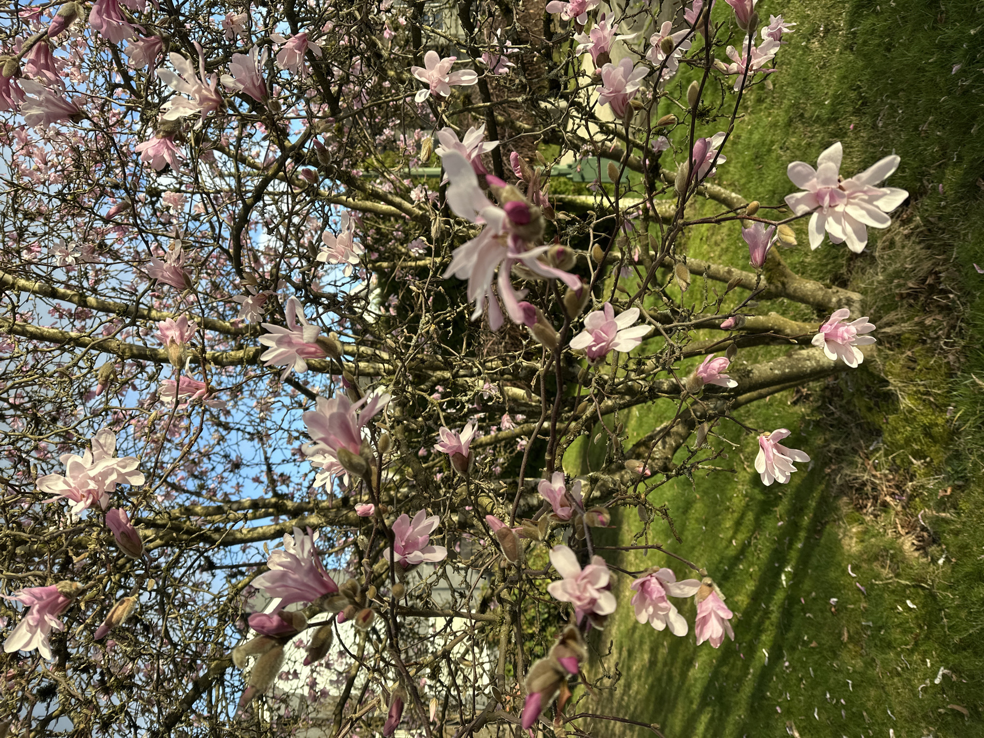 The image captures an outdoor scene in Coquitlam, Canada, featuring a deciduous magnolia tree in early spring bloom. The tree dominates the foreground and midground, its numerous bare, dark brown branches supporting a multitude of light pink to white blossoms and unopened, furry brown-pink buds. Strong sunlight illuminates the tree and the vibrant green grass beneath it, casting distinct shadows. Scattered light pink petals are visible on the lawn, suggesting recent shedding from the tree. Through the tree's branches, a clear blue sky with some wispy white clouds is visible. In the blurred background, a light-colored building structure is partially discernible on the left, and a faint green object, possibly a utility box or container, appears on the right. No individuals, animals, or specific interactions are depicted.
