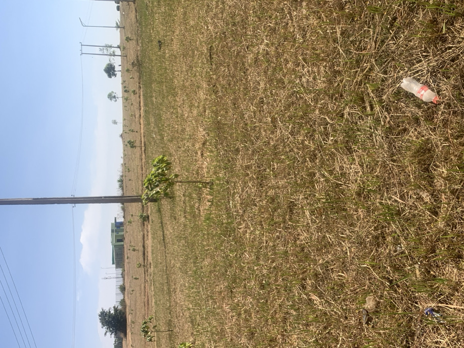 A vast, sun-drenched field stretches towards the horizon, filled with dry, yellowed grass punctuated by sparsely planted young trees. Power lines cut across the clear blue sky on the left. In the distance, structures can be seen. Litter, specifically a plastic bottle, mars the natural landscape in the foreground.