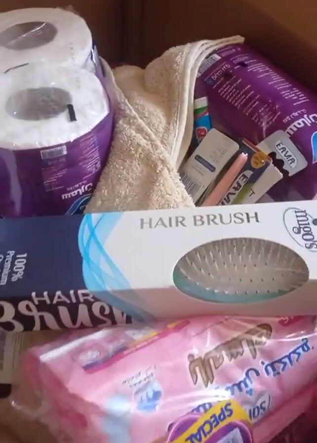 cardboard box filled with various items. The contents include rolls of toilet paper in purple packaging, a light-colored towel, a bottle of purple shampoo, a hairbrush in a blue and white box, and a package of sanitary pads in pink packaging. Other smaller toiletries are also visible. The camera angle is from above, looking down into the box.