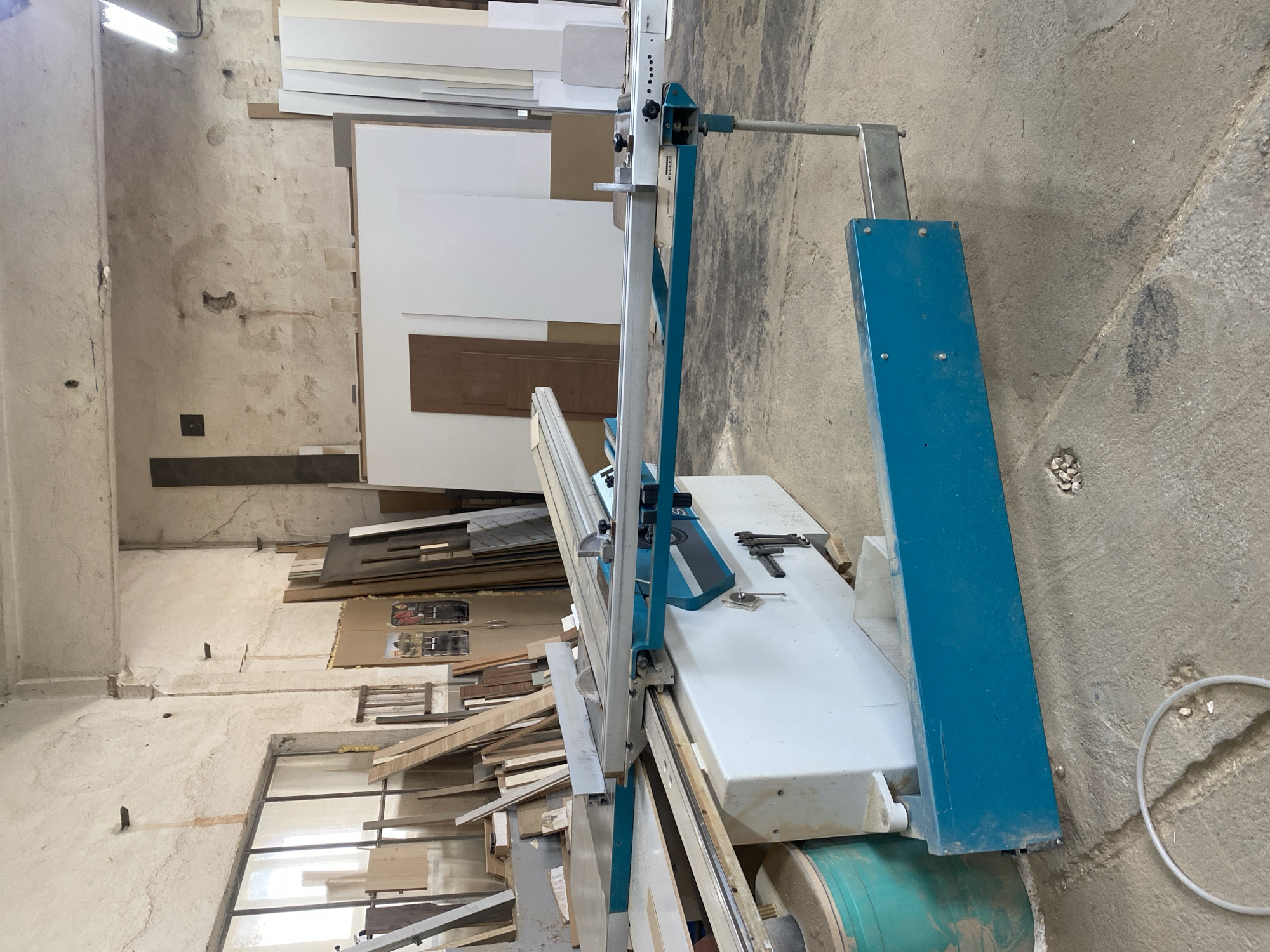 The image presents an interior view of an industrial woodworking workshop located in Pazardzhik, Bulgaria. A prominent teal and white industrial sliding table saw occupies the central foreground, with its circular saw blade exposed on the machine's work surface. To the left, a large multi-pane window allows natural light into the space, illuminating stacks of lumber positioned behind it. A green cylindrical dust collection drum is partially visible at the base of the saw on the left. The workshop walls are constructed of aged, light-colored concrete or plaster, displaying visible cracks, discoloration, and structural details. The concrete floor is grey, appears uneven, and is covered with dust, scattered small white pebbles, and a coiled white plastic tube in the lower-left foreground. On the right side and extending into the background, various sheets of wood paneling and stacks of raw lumber are arranged vertically against the walls. A dark brown door leans against the wall in the mid-right background. A single fluorescent light fixture is affixed to the ceiling in the upper-right portion of the image. No individuals are present in the scene, and no active work is occurring.