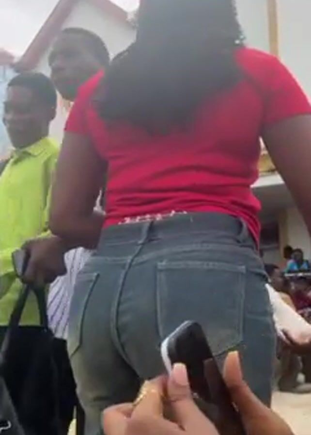 group of people outside a building. The person filming focuses on a woman in a red shirt and jeans. Another person is using a phone to film the woman. The camera then pans up to show the building which has large windows and a decorative roof. Many people are gathered near the entrance of the building. The person filming continues to focus on the woman in the red shirt and jeans. The video appears to have been taken during the day.
