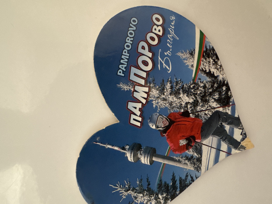 This image displays a heart-shaped souvenir item, likely a magnet or sticker, set against a plain, light-colored background. The item features a winter scene with a clear blue sky over a snow-covered landscape. A smiling individual wearing a red ski jacket, dark pants, a silver helmet, and goggles is actively skiing down a snowy slope, holding two red ski poles. To the left of the skier, a tall, multi-tiered broadcast tower, characteristic of the Snezhanka Tower, rises amidst snow-covered evergreen trees. More snow-laden trees are visible across the background. A stylized ribbon with the colors of the Bulgarian flag (white, green, red) diagonally crosses the middle ground. Prominent text on the item reads "PAMPOROVO" in large, stylized letters and "България" (Bulgaria) in a smaller cursive script below it. The location depicted within the image is Pamporovo, Bulgaria, as explicitly stated on the item. The image does not contain any information relating to Birkova, Bulgaria.