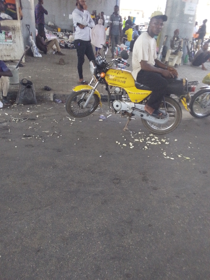 A yellow motorcycle with a dark-skinned man sitting on it dominates the frame. The man wears a light-colored t-shirt, dark pants, and a cap. The motorcycle has lettering on it. Several other people are in the background, some standing and some sitting, creating a crowded atmosphere. The ground is asphalt with scattered debris. Another motorcycle is partially visible to the right, behind the main motorcycle. The scene appears to be in an urban, possibly market-like setting.