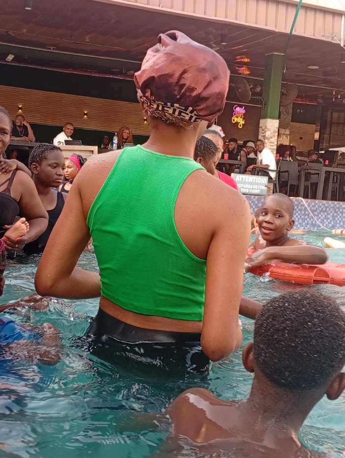 A group of people are enjoying time in a swimming pool. A woman with a brown head covering and green top is in the center. A child in an orange floatation device is looking up with a big smile. Another child with short dark hair is in the foreground. Other people are visible in the background near the edge of the pool and seated at tables in a nearby open-air structure. A sign reads "STEP AREA BEYOND THIS POINT."