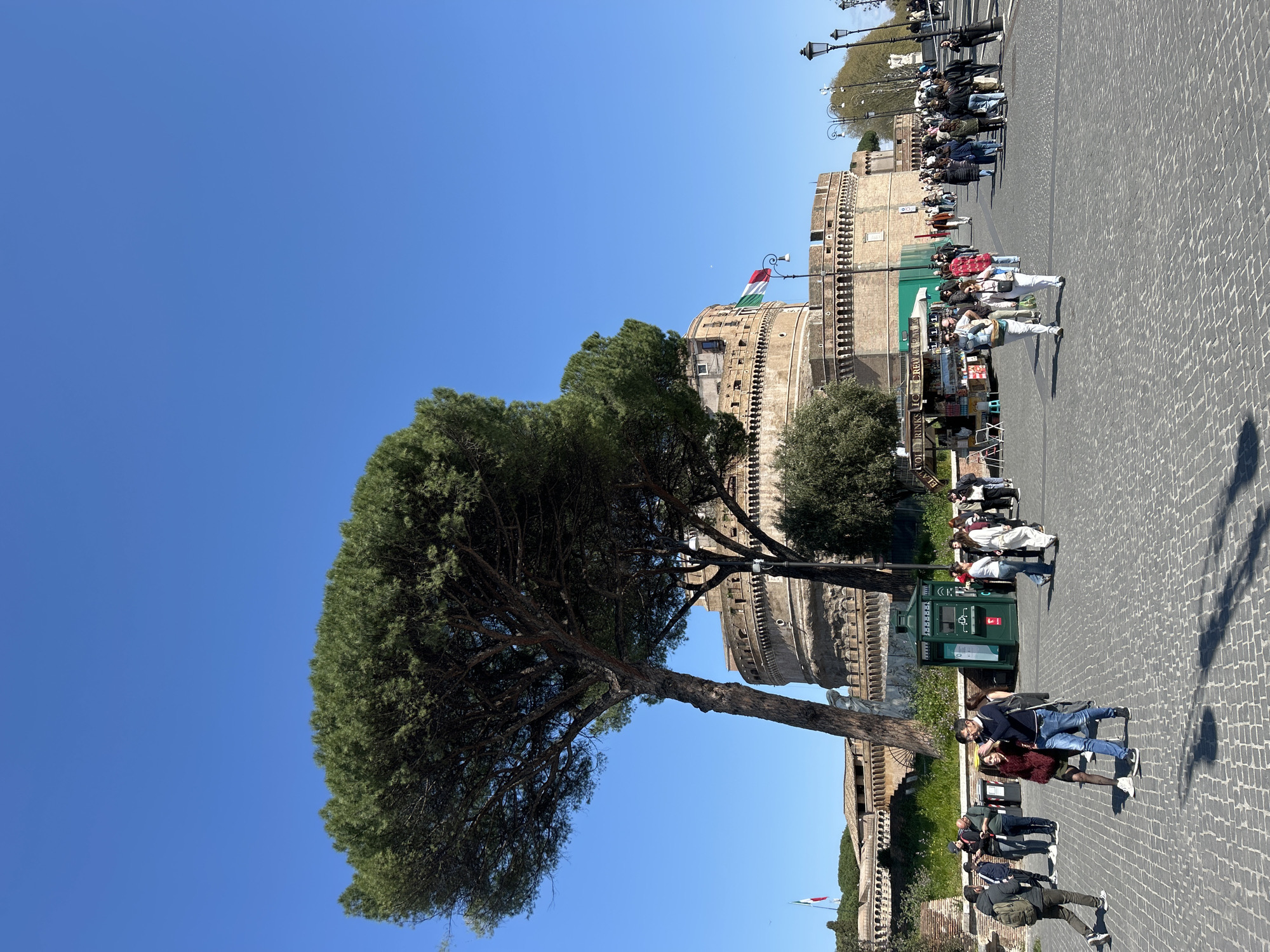 The image depicts a wide-angle outdoor scene in Rome, Italy, specifically in front of Castel Sant'Angelo. The sky is clear and brilliant blue, dominating the upper portion of the frame. The foreground features a cobblestone pavement, on which numerous pedestrians are walking. Distinct shadows of people and trees are cast on the ground, indicating direct sunlight. In the midground and background, Castel Sant'Angelo is the prominent structure, a large, cylindrical, ancient brick and stone building with multiple tiers and crenellated battlements. An Italian national flag, with vertical green, white, and red stripes, flies from a pole on the upper section of the castle. To the left of the castle, parts of its exterior walls and fortifications are visible. Several large, mature pine trees with dense green canopies and thick, dark trunks stand in front of and around the castle, obscuring parts of its base. A dark green, rectangular kiosk, possibly an information booth, is located near the center-left. Further to the right, a street vendor's stall with a white canopy advertises "COLD DRINKS ICE CREAM SOUVENIRS." A diverse crowd of people, primarily adults, are moving across the pavement. Most are casually dressed. In the center-left foreground, a couple walks together; the woman wears a dark red furry jacket and black tights, while the man wears a dark blue sweater and jeans. Individuals are seen singly or in small groups, with some appearing to look at mobile phones. On the right side of the frame, a line of ornate black streetlights extends into the distance.