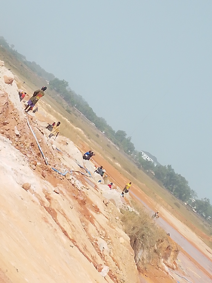 This image depicts an excavated earthen slope within the city of Jos, Nigeria, under a hazy, light blue sky