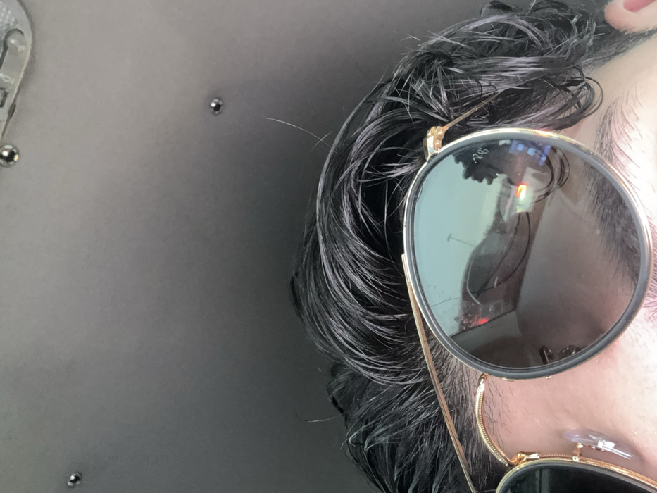 A close-up, low-angle photograph captures the upper portion of an individual's head, primarily focusing on the eyes, forehead, and hair. The subject wears gold-framed Ray-Ban sunglasses with dark, reflective, circular lenses, upon which the "RB" logo is etched on the right lens (viewer's left). Dark, wavy hair is prominent. The sunglasses reflect an external environment depicting vehicular traffic on a road, including red taillights and white/yellow headlights from multiple vehicles, suggesting conditions of dusk, dawn, or overcast daylight. Blurred outlines of a utility pole and distant foliage are also visible in the reflection. Above the subject's head, a dark, textured surface, consistent with the interior roof lining of a vehicle, possibly a car, is present, featuring several small metallic fasteners or fixtures. The individual is situated within a vehicle. The scene is located in Illkirch-Graffenstaden, France.