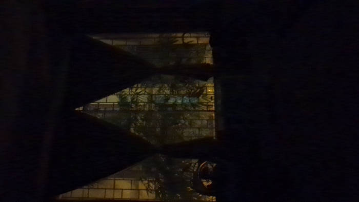 The image depicts a nighttime scene viewed from a darkened interior looking out a window in Hà Nội, Vietnam. Three dark, opaque curtains are partially drawn, framing the exterior through triangular apertures in the upper and central portions of the frame. Beyond the curtains, a window with a prominent grid pattern, consistent with window frames or security bars, is visible. Outside, dense foliage, likely trees or bushes, is dimly illuminated by an external yellowish-orange artificial light source. Behind the foliage, a building facade with a visible grid-like architectural structure is discernible, also lit by the ambient light. On the lower left, a dark, circular object featuring spokes, consistent with a bicycle wheel or a standing fan, is partially visible outside the window, positioned behind the leftmost curtain and foliage. The immediate interior space is predominantly shrouded in darkness, and no individuals or overt actions are present.