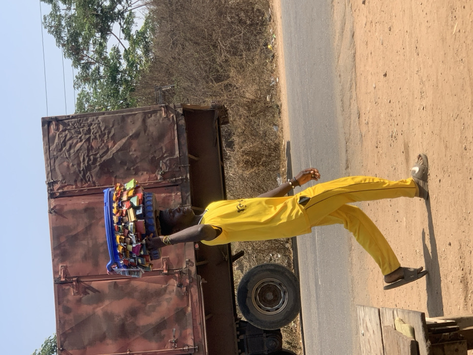 An image taken in Gbeleko, Nigeria, depicts a male individual walking from left to right across a dry, unpaved roadside next to an asphalt road. The individual is wearing a bright yellow short-sleeved shirt with a faint dark logo on the chest and matching yellow track pants with a black stripe down the side. He wears dark slide sandals; the left sandal features a white Nike swoosh. A blue plastic basin, filled with numerous small, brightly colored wallets or pouches, is balanced on his head, supported by his raised left hand. A small white plastic bottle is attached to the left side of the basin. He looks forward to the right. In the background, a large, weathered, dark reddish-brown truck or trailer is partially visible behind the individual, with a large tire present in the lower-left quadrant. The vehicle's cargo body is visibly dented. To the right of the paved road, the environment consists of dry, light brown soil and sparse, dry brown shrubbery. Further in the background, some green trees are visible against a clear, light blue sky. A rough wooden table or bench is partially visible in the extreme lower-left foreground. Faint power lines are discernible in the upper right background. The scene is illuminated by strong daylight.