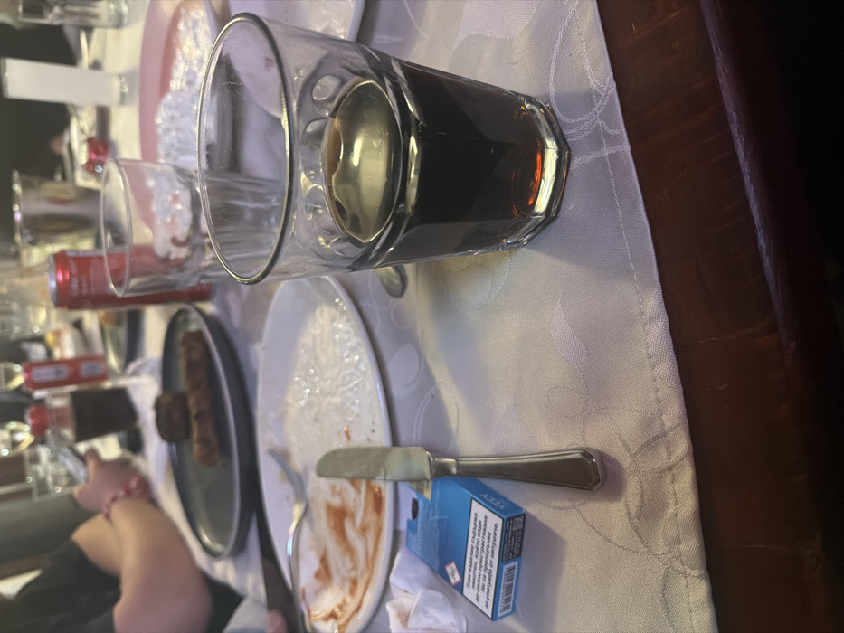 The scene depicts a dining table within an indoor establishment, identified as being in Voluyak, Bulgaria. The table is covered with a white tablecloth featuring a subtle, embossed circular pattern and set with multiple items. In the immediate foreground, a dark wooden table edge is visible beneath the tablecloth. On the tablecloth, positioned centrally, is a clear, octagonal-faceted glass tumbler containing a dark amber liquid, approximately one-quarter full. To the left of this glass, a silver-colored dinner knife with a decorative handle is laid horizontally. Further left, a light blue cigarette pack, labeled "VEEV" and displaying Bulgarian text warning about nicotine, rests next to a crumpled white paper napkin. Behind the knife and cigarette pack, an empty white circular dinner plate with distinct reddish-orange sauce residue (possibly ketchup or paprika) is visible. A silver-colored fork with a dark handle rests on this plate. Beyond this, another clear, empty glass tumbler is present. In the mid-background, slightly to the left, a dark grey oval plate holds two pieces of cooked food: one elongated and cylindrical, the other a thicker disc-shape, both appearing to be meat products. Further back, a red Coca-Cola can stands upright, and a dark brown bottle with a narrow neck is partially visible. Additional blurry glassware, plates, and possibly condiments are scattered across the table. To the far left of the frame, the partially visible arms and upper torso of at least two individuals are present, out of focus. One arm, belonging to an individual wearing a dark short-sleeved garment, displays a red bracelet on the wrist. No direct interactions or specific actions are discernible beyond the implicit act of dining and consumption. The environment suggests a restaurant or communal dining setting with artificial lighting creating reflections on the glassware.
