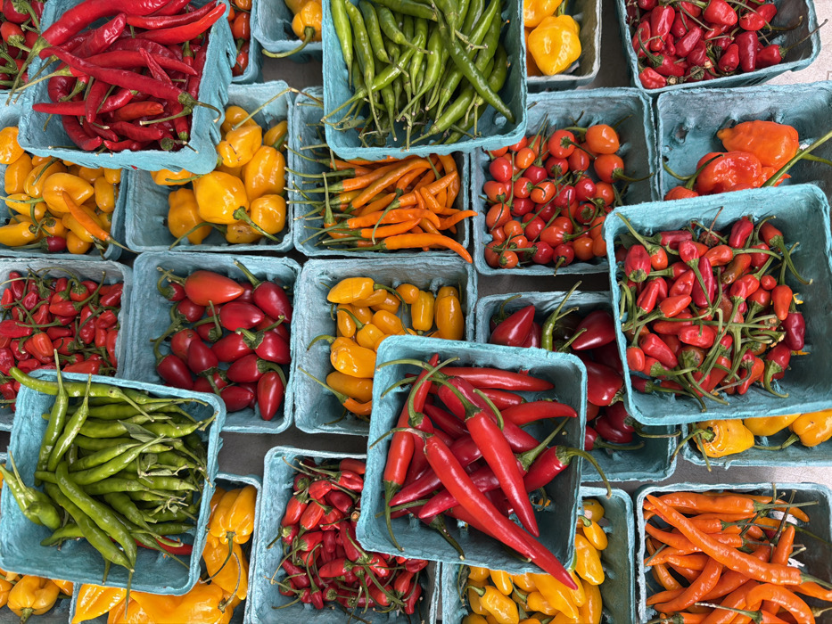 - "This image displays an overhead perspective of numerous varieties of fresh chili peppers meticulously arranged in multiple light blue paper pulp trays" by FM-grnl23, licensed under CC BY 4.0