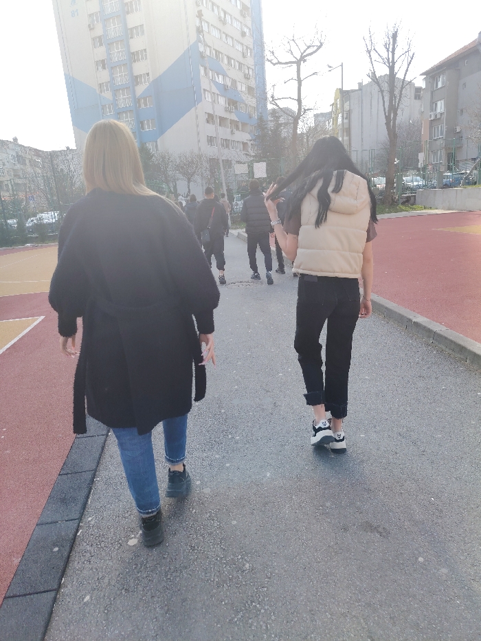 The image depicts an outdoor urban scene in Burgas, Bulgaria, specifically identifiable by the multi-story residential building at ulitsa "Vazrazhdane" 81, visible in the background with its distinctive white and blue geometric facade and the prominent number "81." In the foreground, two female individuals are walking away from the camera on an asphalt pathway. The female on the left has blonde hair and is wearing a dark, long-sleeved coat with a tie-belt, blue jeans with frayed cuffs, and dark low-top shoes. Her left hand is visible. The female on the right has long dark hair, which she appears to be adjusting with her left hand, and is wearing a beige hooded puffer vest over a dark top, black pants with rolled-up cuffs, and white and black athletic shoes with a cat logo visible on the heel. To the immediate left of the pathway is a reddish-orange colored surface, indicative of a sports court, bordered by a dark-colored edge. To the right of the pathway is a concrete curb. Further down the pathway, in the mid-ground, several additional individuals, primarily male, are walking in the same direction. The background features additional multi-story residential buildings and several bare deciduous trees, suggesting late autumn or winter. Fencing is visible behind the sports court. The lighting indicates daylight conditions, with some bright glare in the upper left.