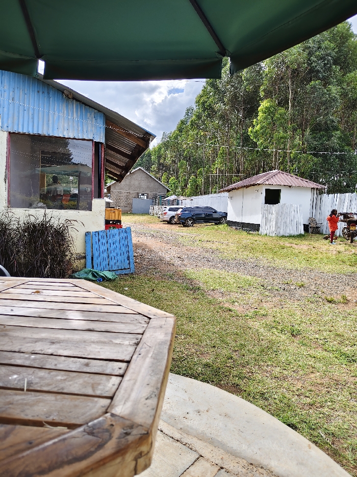 The image depicts an outdoor area in Kongoni ward, Kenya, featuring multiple structures, vehicles, and dense vegetation under an overcast sky. In the immediate foreground, a dark green outdoor umbrella canopy partially obscures the upper frame. Below it, the corner of an octagonal, weathered wooden slatted table is visible on the lower left, resting on a curved concrete slab. In the midground, to the left, stands a building with a light blue corrugated metal upper facade and a lighter-colored lower wall. A large rectangular window in this building reflects the sky and reveals a faint human figure inside. A corrugated metal roof extends beyond the facade. Adjacent to the building's base are dark-leafed plants, a stack of red crates, and a blue wooden barrier or pallet leaning against the wall, with a crumpled green tarp on the ground nearby. A gravel path extends from the left midground towards the background, flanked by patches of green grass. Two vehicles are parked on the path: a light-colored car (likely an SUV) and a dark-colored sedan or SUV. To the right of the gravel path, a small, white, single-story building with a reddish-brown peaked roof is present. It features a dark, open rectangular aperture on its front facade. A white picket fence extends from this building to the right. A small human figure, clothed in orange or red, stands near the fence line, facing away from the camera, next to a parked dark-colored motorcycle or scooter. The background is dominated by a dense stand of tall, slender trees with light green foliage, indicating a forested or wooded area, possibly on an incline. Above the trees, a cloudy sky is visible. A grey concrete block structure, possibly under construction, is partially visible behind the parked vehicles.