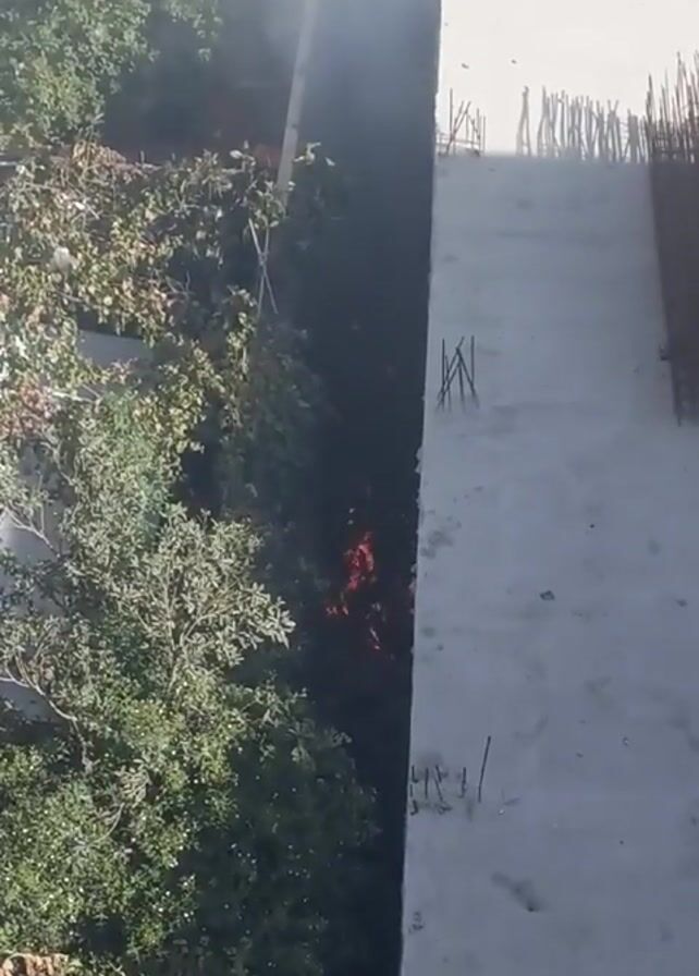 fire burning in a narrow space between buildings, obscured by trees. Smoke rises from the flames, which are visible in the lower center of the frame. To the right, a concrete structure with exposed rebar is visible. Green trees and foliage are to the left. The camera is positioned above the scene.