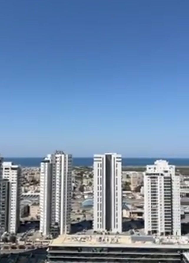 panoramic view of a modern cityscape on a clear, sunny day. The scene is dominated by numerous high-rise buildings with predominantly white or light-colored facades. These buildings are distributed across the urban landscape, interspersed with lower-level structures and green spaces. In the distance, a body of water, presumably the sea, is visible, meeting the horizon under a clear blue sky. There is evidence of construction activity in certain areas, with large construction sites and earth-moving equipment present. The scene is viewed from an elevated position, providing an expansive perspective of the city sprawling out towards the coastline.