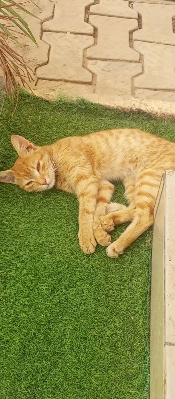 An orange tabby cat sleeps on a patch of bright green artificial grass. The cat is curled slightly, its paws tucked together. The cat’s eyes are partially open. A border of tan paving stones runs along the top edge of the grass, and a beige wall is visible along the right edge. A few leafy stems are visible in the upper left.
