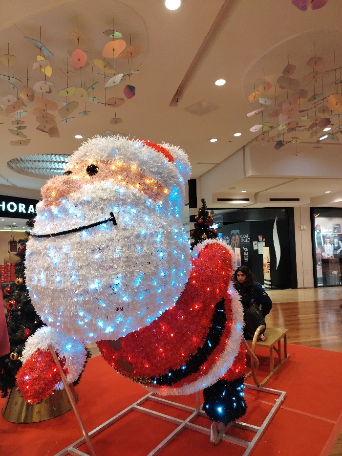 This image captures an indoor scene within a shopping mall in Strasbourg, France, specifically a festive display during the Christmas holiday season. The central focus is a large, brightly illuminated Santa Claus decoration positioned in the foreground. This three-dimensional Santa is constructed with white and red tinsel-like material over a framework, extensively adorned with blue, white, and red LED lights. The Santa's face and beard are white with blue and white lights, while its hat, suit, and boots are red with red and black lit accents. It is depicted as if seated on a light-colored, skeletal sled frame and is supported by two thin, light-colored poles extending from its left arm. This entire display rests on a red carpet. To the right of the Santa, in the mid-ground, a young female with dark hair, wearing a dark jacket, is seated on a light-colored wooden bench, facing towards the right side of the frame. Two smaller, decorated Christmas trees are visible behind and to the left of the Santa. The background reveals multiple storefronts characteristic of a shopping mall, including a partially visible "Sephora" sign on the far left and a "Clic & Celec" sign further back on the right. The mall floor is composed of light-colored, reflective wooden planks. The high, off-white ceiling features numerous recessed circular lights and is adorned with multiple clusters of abstract, multi-colored, translucent, leaf-like suspended decorations. The scene is brightly lit by artificial light sources.
