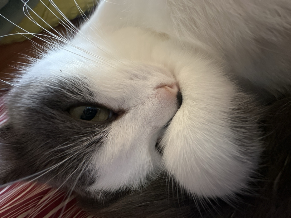 A domestic cat is depicted in a close-up shot, curled up indoors in Dobrich, Bulgaria. The animal exhibits bi-color fur, predominantly white on its face, chest, and right paw, with dark grey or charcoal fur covering the upper left side of its head and visible along its back. Its right paw is positioned against its face, partially obscuring the muzzle and covering the left side of its pink nose. The cat's left eye, visible on the upper left side of the frame, is a yellowish-green hue with a vertically slit pupil. Sparse white whiskers extend from the white facial fur. The background on the upper left consists of a red fabric with an indistinct white pattern, while the upper right and far background are a blurred yellow/orange tone.