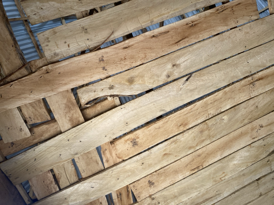 The image displays the underside of a roof or ceiling structure within a building in Okura, Nigeria. The primary subjects are multiple light-toned wooden planks, exhibiting natural grain, knots, and varying shades of tan to light brown. These planks, appearing roughly sawn with some irregular edges, are arranged in a diagonal pattern across the frame. Small dark fasteners, consistent with nails, are visible securing several of the planks. Gaps exist between many of the wooden planks, revealing sections of a light-colored, corrugated metal sheet beneath or above them, indicating the roofing material. No individuals, explicit actions, or other discernible objects are present in the depicted environment.
