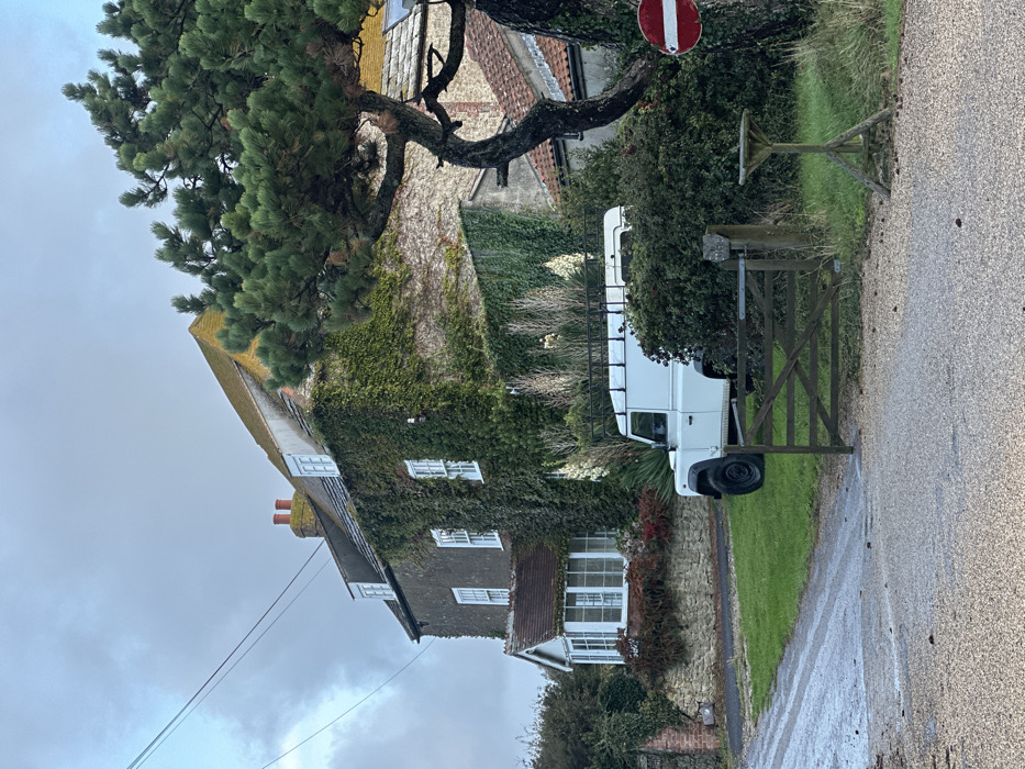 The image depicts a residential property in a semi-rural area of Weymouth, United Kingdom, under an overcast sky. The central feature is a three-story, dark-faced house, extensively covered in green ivy, featuring multiple white-framed sash windows and two dormer windows on its moss-dappled, tiled roof. Two red-brick chimneys are visible atop the roofline. A single-story, multi-windowed conservatory extends from the lower left facade of the house. In the immediate foreground, a wet gravel lane leads to a partially open wooden five-bar gate. To the right of this gate, a white Land Rover Defender 110, fitted with a black roof rack, is parked on a grass verge, partially obscured by dense green shrubbery. Tall white-flowering plants are visible behind the vehicle. A prominent pine tree with a gnarled trunk is positioned on the right, partially obscuring a red circular 'No Entry' sign with a white horizontal bar, and an adjacent building with a lighter facade and red-tiled roof. A rustic wooden stand is present near the gate. No individuals are visible in the scene.