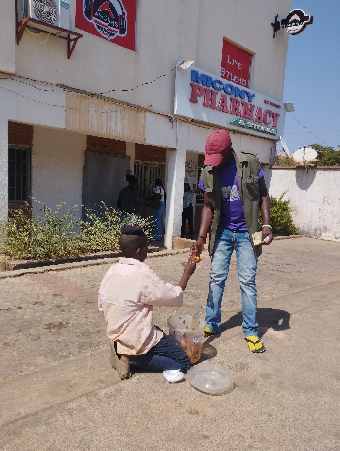 - "The image depicts an outdoor transaction occurring under bright daylight in Gura Top, Nigeria, in front of a white, two-story building identified by prominent signage as "MICONY PHARMACY & STORES" and "AMSONS STUDIOS / LIVE STUDIO" by FM-zRozC3, licensed under CC BY 4.0