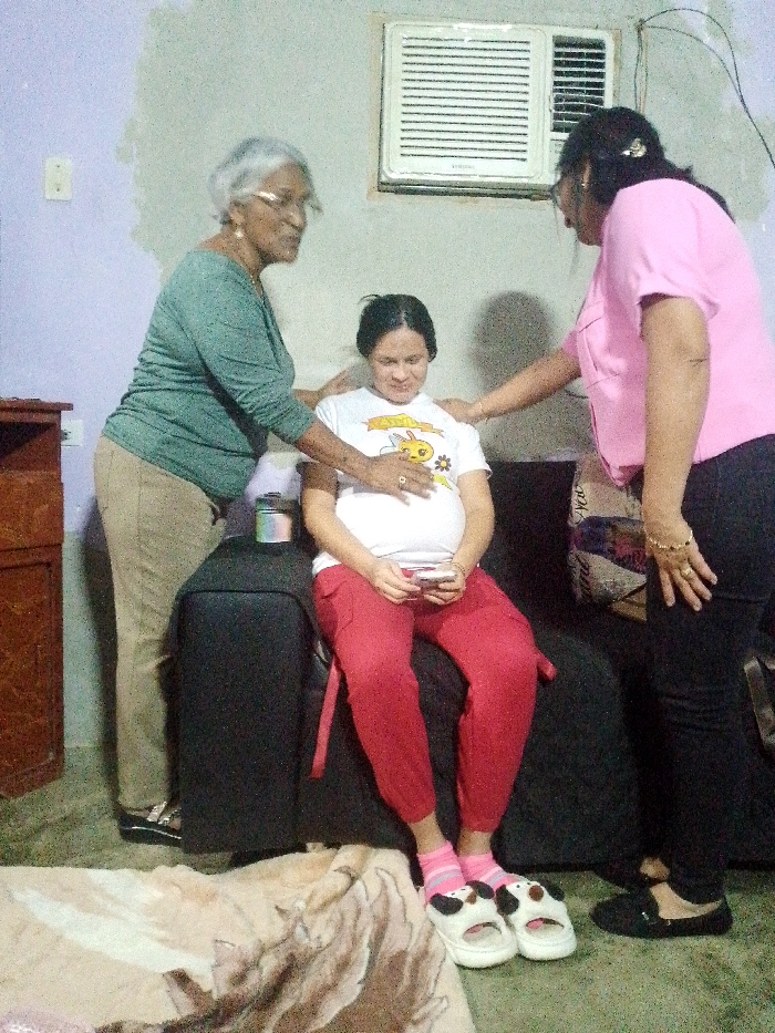Three women are in an indoor setting. One woman sits on a dark couch, wearing red pants, a white t-shirt, and dog-themed slippers, looking at a device in her hands. An older woman with gray hair stands to her left, wearing tan pants and a green sweater. To the sitting woman's right stands another woman in black pants and a pink shirt. Both standing women have their hands on the seated woman. Above them is an air conditioning unit. A wooden dresser is visible on the left, and a patterned blanket lies on the floor.