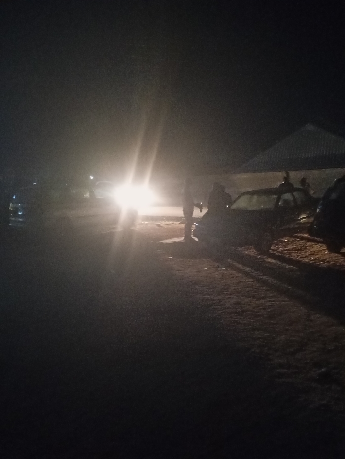 The image depicts an outdoor night scene in the city of Jos, Nigeria. Illumination is provided primarily by artificial light sources, notably the bright headlights of a vehicle positioned centrally, facing the viewer. This intense light creates a significant lens flare and silhouettes multiple human figures standing in the immediate vicinity of the light source. To the right of the central vehicle, a dark sedan is parked or stationary, with its driver's side door appearing to be open or partially ajar. Several human figures are observed congregated around this sedan; one individual is leaning into or is partially within the vehicle's interior. Other figures stand nearby, interacting within the group. A third vehicle, possibly an SUV or truck, is partially visible on the far-left edge of the frame. The ground surface is unpaved, consistent with dirt or sparsely vegetated earth, showing visible texture under partial illumination. In the upper-right background, a building with a dark, sloped roof, possibly constructed of corrugated metal, is discernible, partially lit. Long shadows are cast across the ground, originating from the visible light sources. The scene portrays a nocturnal gathering of individuals and vehicles.
