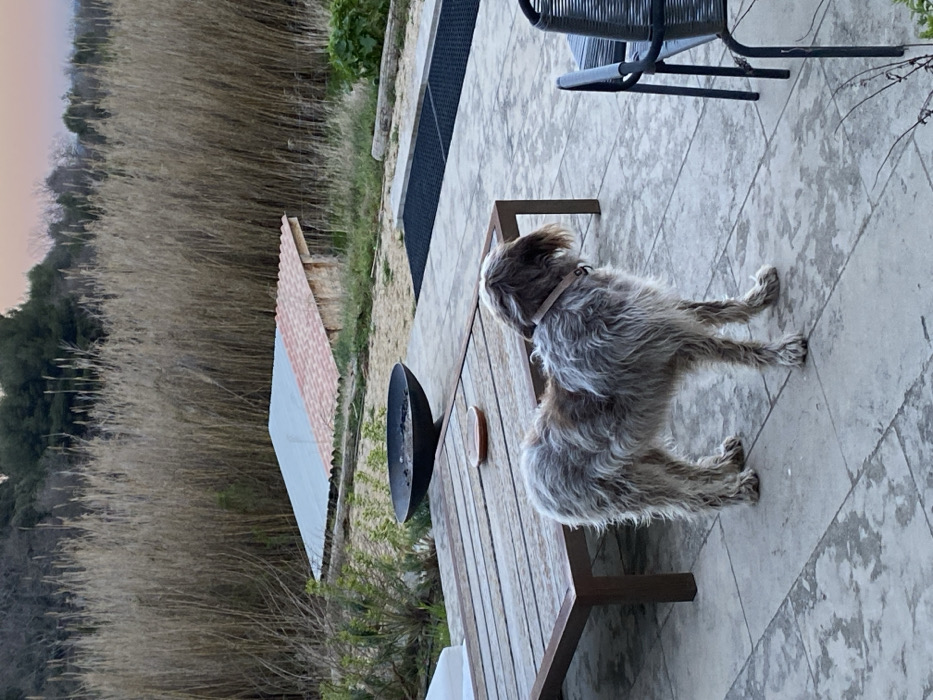 The scene depicts an outdoor patio area in Cucuron, France, observed during low light conditions consistent with dawn or dusk. A medium-sized, wirehaired dog with mottled grey, white, and brown fur, wearing a light-colored collar, stands in profile on a light-toned paved patio, facing right. To the dog's left, a rectangular wooden patio table with a dark metal frame features a small, round, terracotta-colored dish. To the right, a portion of a dark grey woven patio chair with a metal frame is visible. Further into the scene, a black, bowl-shaped metal fire pit containing embers or ashes is situated on a patch of light-colored earth. Adjacent to the fire pit, integrated into the paved surface, is a dark, rectangular grated section. In the mid-ground, two small, low-profile structures are present: one with a light grey corrugated roof and another with a red-tiled corrugated roof, situated on an unpaved area of dirt and sparse vegetation. The background is characterized by a dense stand of tall, dry reed-like vegetation, with evergreen trees visible beyond, under a sky displaying a faint orange-pink hue near the horizon.