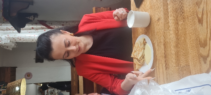 The scene depicts an interior setting, likely a cafe or restaurant, located in Noviy, Russia. A female individual with dark hair pulled back, wearing a red blazer over a black top and gold-colored hoop earrings, is seated at a light-colored wooden table. Her gaze is directed downwards towards the table's surface. On the table, a white plate holds two folded crepes or pancakes accompanied by a quantity of light-colored sauce. Adjacent to the plate, a white mug contains a white liquid. Her right hand, adorned with a ring on the ring finger, rests on the table, while her left hand, displaying painted fingernails, is partially visible near a white plastic bag with blue markings in the lower-left foreground. A portion of another person's arm or shoulder is faintly visible to the left of the main subject. The background features light-colored walls, wooden bench backs, and a window draped with white floral-patterned curtains. A woven pendant lamp hangs from the ceiling in the upper-left, and a small decorative plate and a wooden shelf with a dark object are visible on the wall.