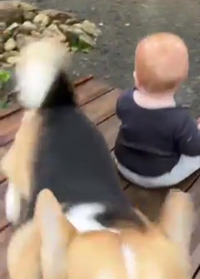 On a wet, wooden deck, a corgi approaches a baby sitting on the deck. The dog begins barking. The dog moves in front of the camera, which pivots and focuses on the car parked on the other side of the deck railing. The camera pivots back to the baby who is still sitting on the deck. The camera continues moving away from the baby and toward the yard.