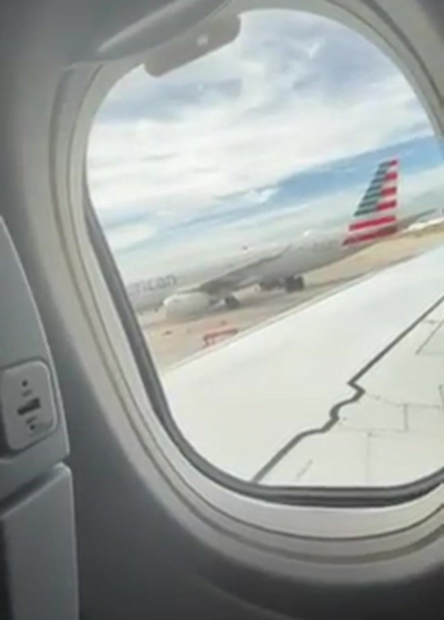 view from an airplane window, looking out over the wing of the plane to another American Airlines plane parked at a gate. The plane is connected to a boarding bridge. The sky is visible with patches of clouds. There is a USB charger next to the window.