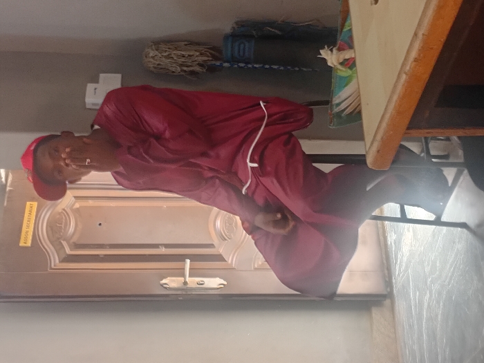 An adult male is seated on a black metal stool in an indoor setting. He wears a red long-sleeved tunic-style garment and a red baseball cap worn backward. A ring is visible on the index finger of his right hand, which is raised to cover his mouth. His gaze is directed forward. To his left is a closed brown metallic security door featuring decorative paneling, a silver handle, and a peephole. A rectangular yellow sign with black text reading "ASSON SECRETARIAT" is affixed to the upper portion of the door, identifying the location as an administrative office in Minna, Nigeria. The wall to the immediate left of the door is light-colored, while the wall to the male's right is grey. A small white square object is mounted on the grey wall, below which a beige string mop hangs. A colorful patterned bag or container is partially visible on the floor beneath the mop. In the lower right foreground, a segment of a wooden table with a light-colored top is present. The floor is tiled with a light grey, possibly marble-patterned, surface.