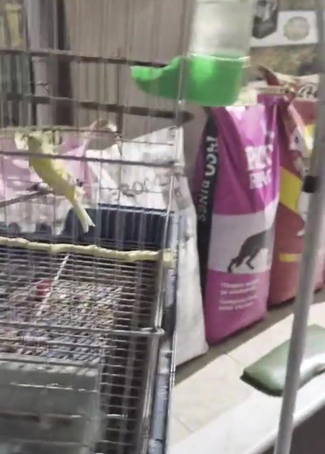 The video depicts a birdcage containing two small, yellow birds, perched inside. The cage is made of metal and has a wire mesh construction. Inside the cage are perches and food and water dispensers. Surrounding the cage are bags of pet food lined up against the wall behind it. The bags are various colors including pink, white, and yellow. The scene appears to be in a store, as suggested by the presence of pet food and other items stacked nearby. A few cardboard sheets are laid out on the floor. The location of the store is not clear.