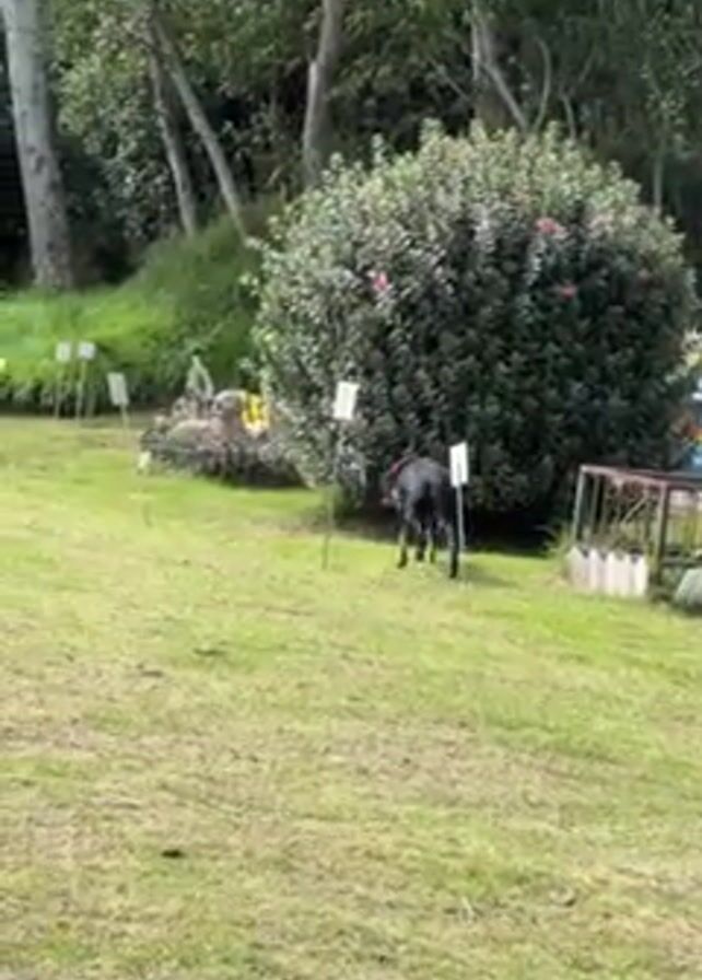black dog walking across a grassy field in a park-like setting. The dog has a red collar and is moving away from the camera. There are several small white signs on stakes scattered across the field, along with flowers and decorative items. A large bush with pink flowers sits to the right of the dog, and trees surround the grassy area. The overall environment appears peaceful and natural.