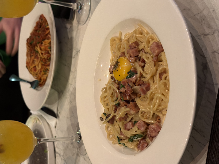 This image depicts a dining scene inside a restaurant in Givatayim, Israel. The foreground is dominated by a white, wide-rimmed bowl containing spaghetti carbonara. The pasta is coated in a creamy sauce, mixed with numerous diced, cooked ham or bacon pieces, and some dark green leafy elements. A raw, unbroken bright yellow egg yolk, topped with coarse black pepper, rests centrally on the pasta. To the left foreground, a stemmed glass holds an orange beverage. In the background, another white, wide-rimmed bowl contains spaghetti with a rich red sauce, likely bolognese or marinara, with a silver fork resting within it. To the right background, a partial view of a second stemmed glass with an orange beverage is visible. The table surface is a light-colored marble-patterned material. Blurred human hands are visible in the deep background, one of which appears to be wearing a green sleeve, indicating the presence of at least two individuals. The lighting is subdued, suggesting an indoor evening setting.