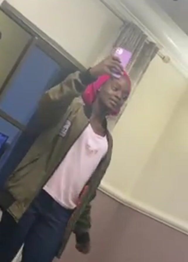 A young woman wearing a pink head wrap, a white t-shirt, an olive green bomber jacket, and dark blue pants is recording a selfie video with a purple phone