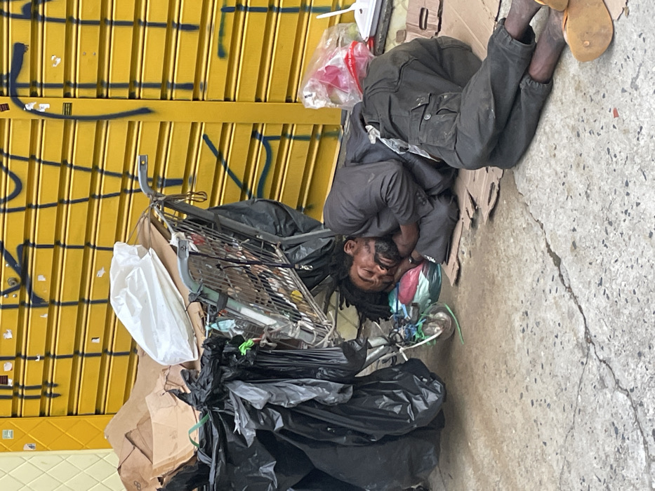 - "An adult male with dark skin, dreadlocks, and a beard is depicted sleeping on his right side on cardboard pieces laid on a grey concrete sidewalk" by FM-iYMz92, licensed under CC BY 4.0